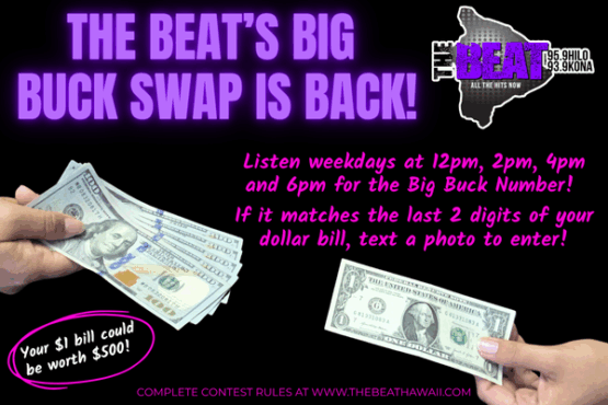 The Beat’s Big Buck Swap kennyb / October 27, 2025 The Beat’s Big Buck Swap is back! Listen weekdays at the top of the 12PM, 2PM, 4PM and 6PM for the Big Buck number! If those digits match the last […] Read More »